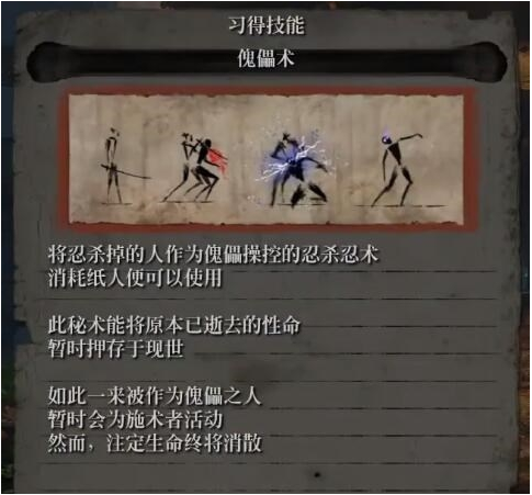 可以将忍杀掉的人作为傀儡操控,作为傀儡之人暂时会为施术者活动,然而注定生命终将消散,消耗纸人即可发动。同时这个忍杀忍术在解锁“白蛇神”奖杯(忍杀白蛇神)时是必不可少的。