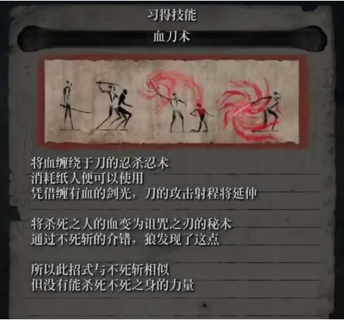 可以将血缠绕于刀,凭借缠有血的剑光将刀的攻击范围大幅延伸,消耗纸人即可发动。