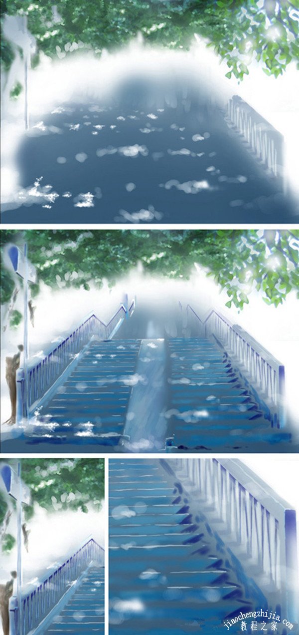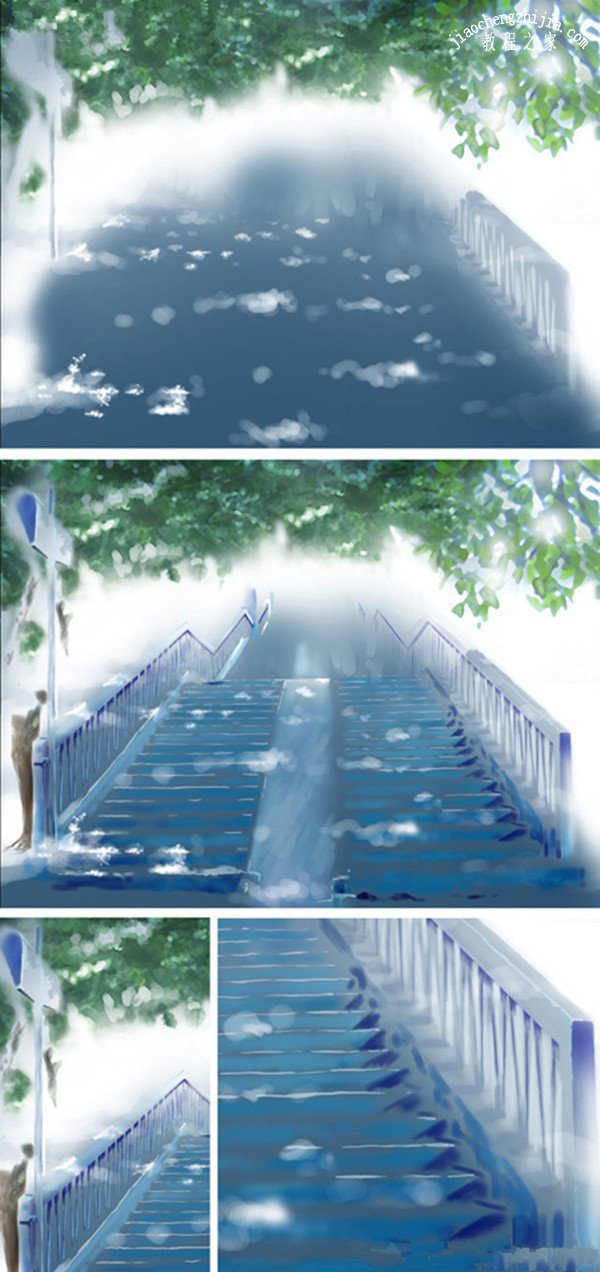 8、新建一个图层,命名为“影1”。用【喷枪柔边圆形】笔触把需要做树影的地方用深蓝色刷一下,有阳光偷光的地方也用橡皮擦工具擦一下。这样做的效果是为了贴近现实,树影下的阶梯颜色应该更深才是。