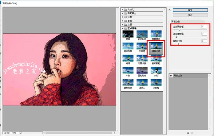3、展开艺术效果,找到“海报边缘”滤镜,然后设置右侧的数值,建议设置为2、1、1,具体效果根据图片来设置(看效果,主要为了增强阴影部分);