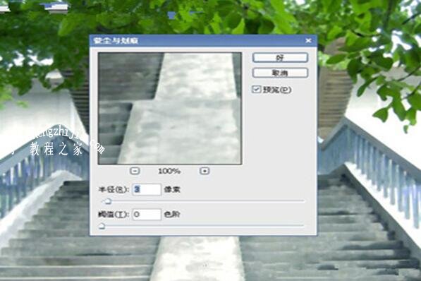 3、选择工具栏中的滤镜,选择杂色的蒙尘与划痕功能点击,将照片调整出有绘画的画面感觉,参数不一定参照下图的。