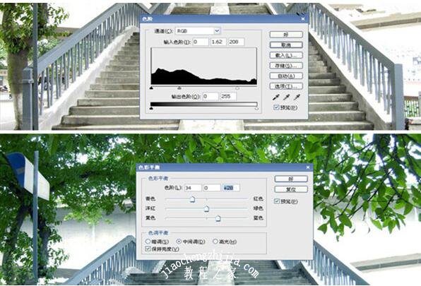 4、因为希望画面呈现出阳光明媚的中午时刻的效果,需要再次选择工具栏的图像,点击调整中的色彩平衡,把画面颜色调得更蓝。接着点击色阶工具把图片的亮度调得更高,稍微突出轮廓,稍微有阳光的感觉。具体参数请查看下图。