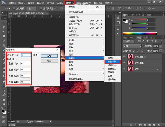 4、点击确定之后,继续选择滤镜——像素化——彩色半调,设置最大半径为4,其他的数值为45(建议大家先Ctrl+J复制背景副本,然后再执行该步骤,方便之后设置彩色半调的透明度);