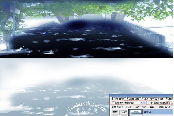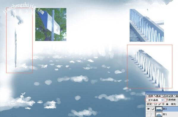 12、在远处的画面上再画出树的倒影,做到这个步骤是考验细心的时候,把图层属性改为“正叠底片”。