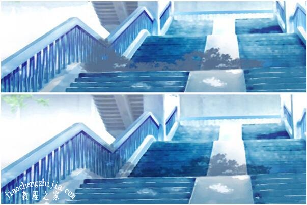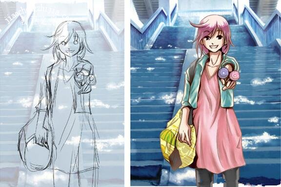 对比一下调整前后的效果,修饰过的图片比较平正,光影已经稍微有原型。阴影效果使得画面的立体感逐渐显现出来,更像动漫场景。