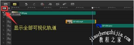 答:当用户在时间轴面板中,添加多个轨道和视频文件时,上方的轨道会隐藏下方添加的轨道,只有滚动控制条才能显示预览下方的轨道,使用起来非常不方便,其实显示全部轨道信息的方法很简单,只需单击时间轴面板上方的“显示全部可视化轨道”按钮,即可显示全部轨道。