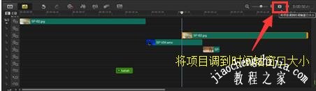 答:当用户在时间轴面板中,在轨道上添加多个素材文件时,轨道右侧的内容会隐藏在右侧,只有滚动控制条才能显示右侧轨道上的素材,使用起来非常不方便,这里只需单击时间轴面板上方的“将项目调到时间轴窗口大小”按钮,即可显示全部素材。