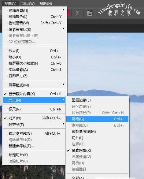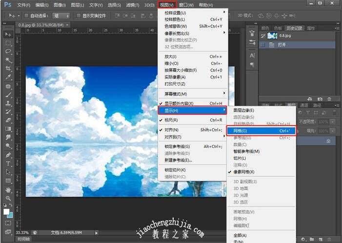 1、首先在Photoshop中使用Ctrl+O打开一张图片,然后点击上方的视图——显示——网格打开网格线,如果需要关闭也可以按照此步骤关闭网格线;