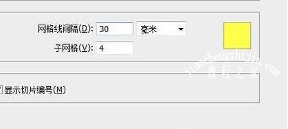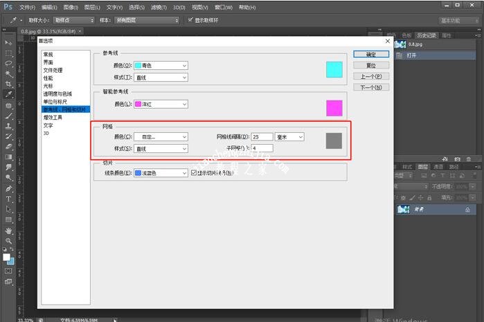 3、最后在参考线、网格和切片内设置网格,可以修改颜色、网格线之间的间隔、网格线样式、子网格的数量等,设置为完成后点击“确定”保存设置;