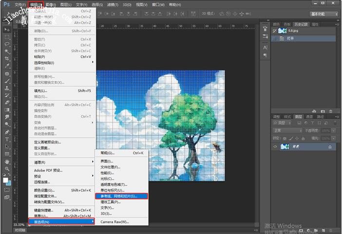 2、如果需要设置为网格线的颜色、样式、间隔、子网格数量,可以点击上方的编辑——首选项——参考线、网格和切片打开设置。(或者Ctrl+K打开常规,选择参考线、网格和切片)