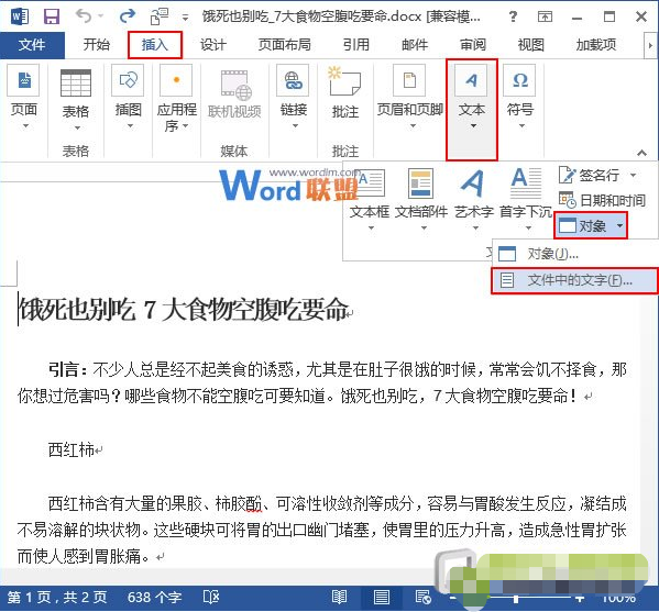 1、用Word2013打开其中一篇文档,选中其它文档插入的位置,然后切换到“插入”选项卡,单击“文本”组中“对象”里的“文件中的文字…”选项。