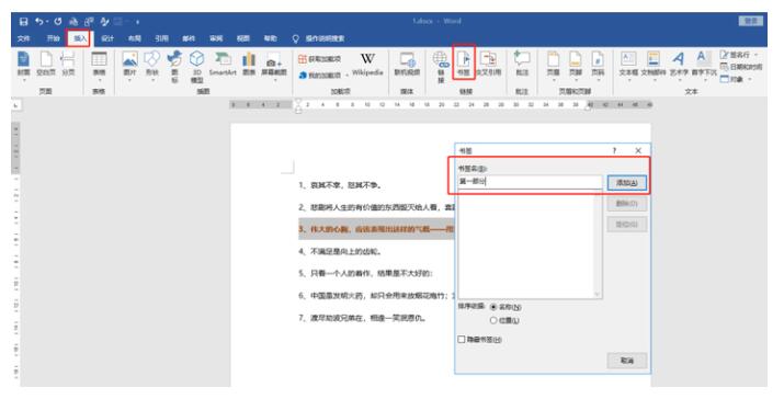 1.首先选中文档中需要合并的内容,依次点击菜单栏中的插入→书签→添加书签名“第一部分”(这里书签名随便输入)