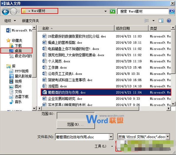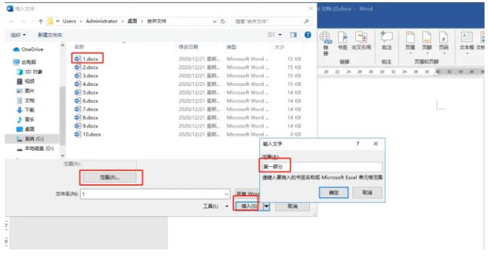 3.最后在弹出的【插入文件】对话框中,选择刚才添加过书签的word文档,选择文件后,单击【范围】,在弹出的【输入文字】对话框输入,刚刚定义的书签名【第一部分】,单击【插入】即可,其余文档操作方法以此类推。