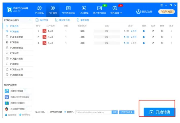 2.添加完需要合并的PDF文件后,点击【开始转换】,合并之后的PDF文件会自动保存到电脑桌面上,方便我们查找。