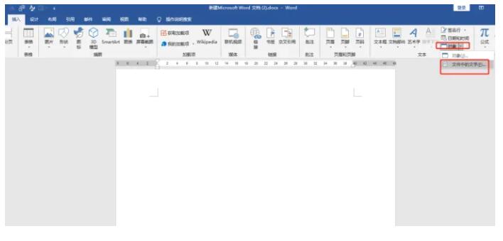 3.然后在插入功能中找到【对象】,点击打开后选择里面的【文件中的文字】。然后就会出现一个弹窗,找到之前新建的文件夹,选中需要合并的所有文档。最后点击插入,这样所有文档中的内容都合并到一起了。
