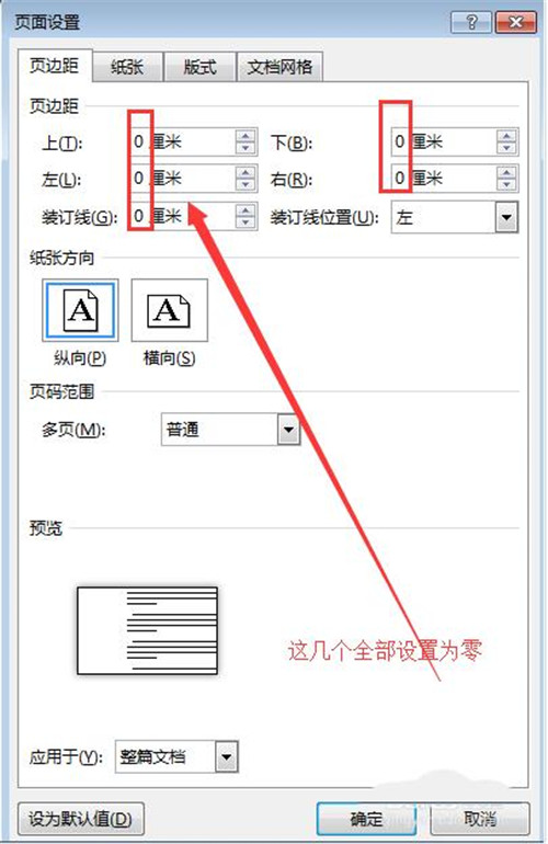 4、弹出页面设置对话框,将页面边距的上下左右以及装订线均设置为0。