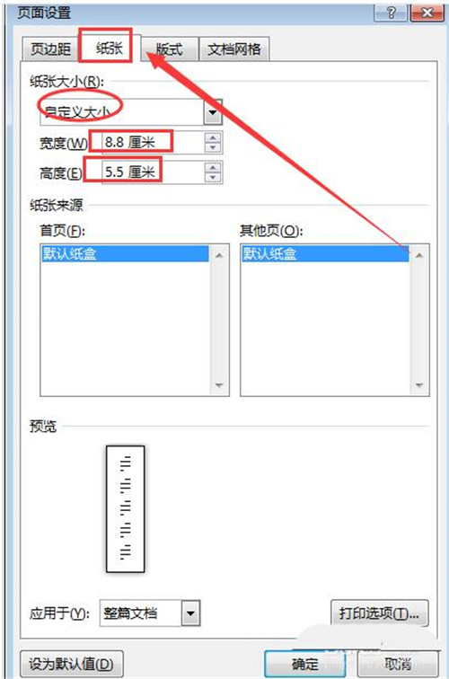 5、然后切换到纸张设置面板,选择纸张大小为自定义大小,名片的最合适的高度和宽度分别是8.8厘米和5.5厘米,设置好后点击确定。