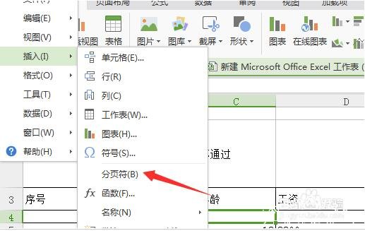 5、进行选中了插入之后,弹出了下一级菜单选中为分页符的选项。