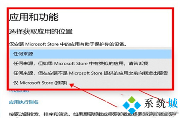 3、选择第三条安装外部软件的时候发出警告,这时候用户就可以选择是否安装,或者直接选择“仅Microsoft Store”,这时候电脑就会拒绝任何外部软件的下载。