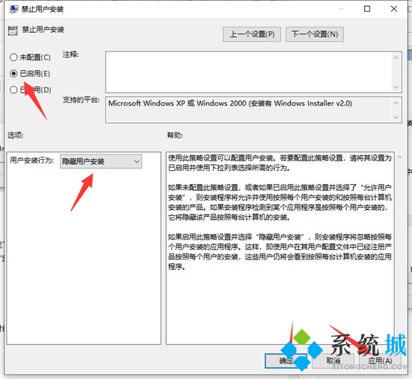 3、打开“禁止用户安装”并选择“隐藏用户安装”,电脑也不会自动下载乱七八糟的软件了。