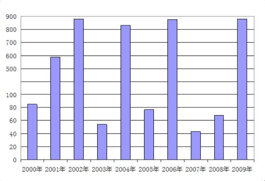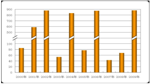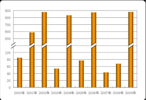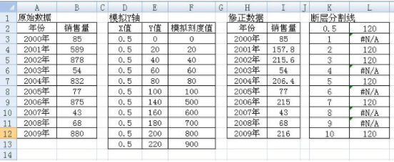 构造模拟Y轴数据:根据原始数据(见上图)可以看出,销售量数据主要集中在0-100与500-900这两个区域,因此可以假设模拟Y轴的主要刻度值 为{0;20;40;60;80;100;500;600;700;800;900},如下图中F3:F13单元格所示;假设实际Y轴的主要刻度单位为 20,120网格线作为分割线,根据模拟Y轴刻度值与实际Y轴刻度值的对应关系,可以求出模拟Y轴的Y值,在E3单元格输入公式:=IF(F3》140,F3/5+40,F3)(说明:因为140刻度线刚好与模拟刻度值500相对应。)