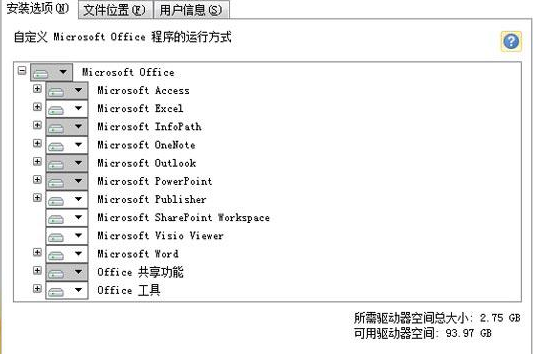其中安装选项:如果你只需要安装常用的Word、Excel及PPT的话,那就把剩余的都叉掉吧,但记得Office工具保留哦。