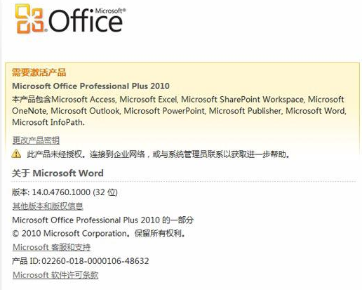 5、OK了,安装成功了。。会提示你联网激活,不过我们都使用KMS或者Toolkit激活的方法,所以取消吧,然后打开一个新的文档,在帮助菜单里可以看到已经安装的Office 2010尚未激活。