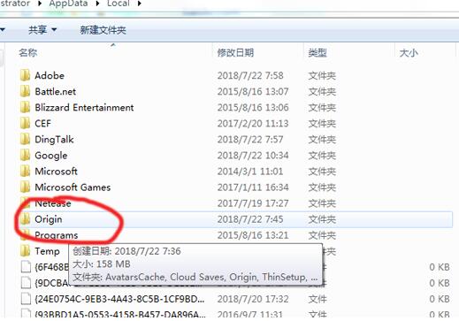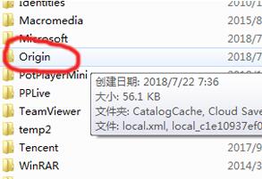4、之后返回【appdata】文件夹,找到【Local】文件夹,进入,里面也有个【Origin】文件夹,进入后删除里面所有文件