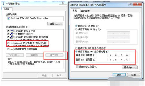 打开本地连接和WLAN连接(无线网用户)的IPv4的属性页面,并选择手动添加DNS服务器地址即可。