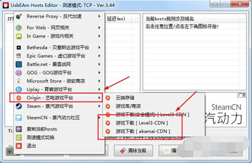 修改编辑Hosts也不是很难,但是要选择合适的IP地址是比较麻烦的,但是这里推荐一个软件叫UsbEAm Hosts Editor,它就是能够专门为你选择合适的加速IP地址,然后自动帮你修改hosts。新手玩家不要错过。