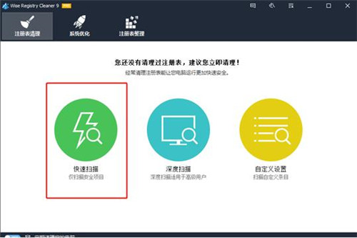 3、运行软件后,点击注册表清理,快速扫描,扫描结束后即可清理,清理后提示重启