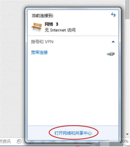 1,点右下角黄色感叹号,左键打开网络和共享中心