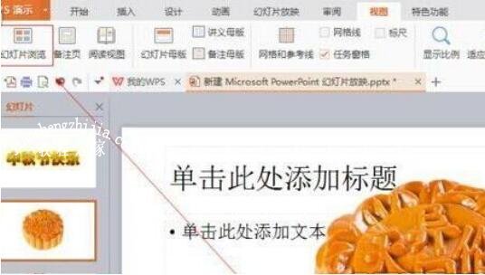 3、如图所示,我们点击箭头所指的的“幻灯片浏览”这一项。