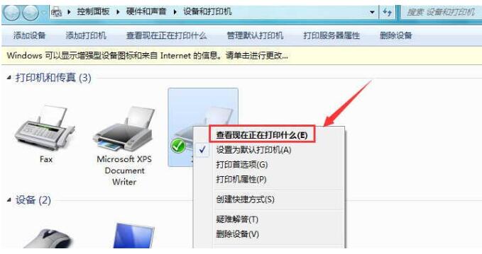3、接着我们右键灰色的打印机,检查目前正在打印的任务。