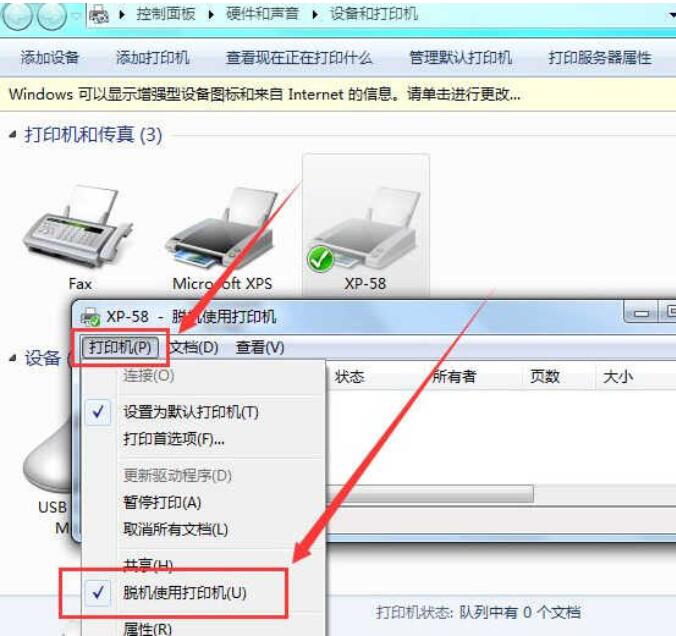 4、然后点击左上角的打印机这三个字,再点击正在使用的打印机,把脱机使用打印机的勾选去掉。
