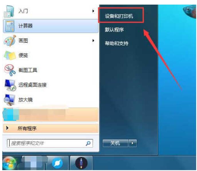 1、先从电脑开始菜单图标处打开设备和打印机(在控制面板同样可以找到设备和打印机选项)