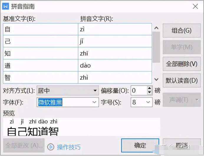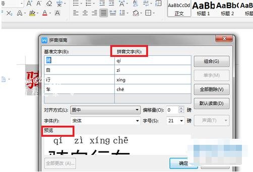 4. 之后就会出现下图所示窗口,在“拼音文字”处已经自动生成了文档中文字的拼音,并且还能在“预览”下查看效果。