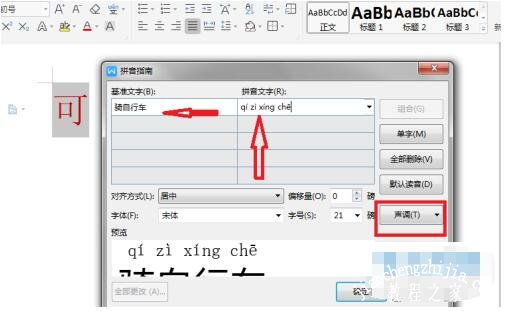 6. 同时我们也可以只选中任意一个文字,进入“拼音指南”,在“基准文字”处输入其他需要注拼音的汉字,再在“拼音文字”处将相应拼音输入也,最后再点击“声调”选择相应的声调即可。确认无误后,点击“确定”就可以了。