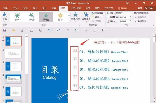 二、批量删除PPT动画方法一:传统的方法,主要是一页一页的进行修改,比如说,是这样的操作,选中动画效果之后,然后按delete键盘进行删除,但很累人。