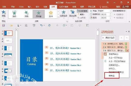 方法二:所以就有了这省事的方法,选中幻灯片,然后在动画窗口,一次性选择全部的动画效果,右键进行删除,但坏处在于,如果后续需要动画,这操作是不可复原的。