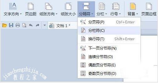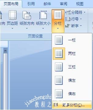2、单击页面布局----分栏按钮,在弹出的选项中选择一种所需要的类型;