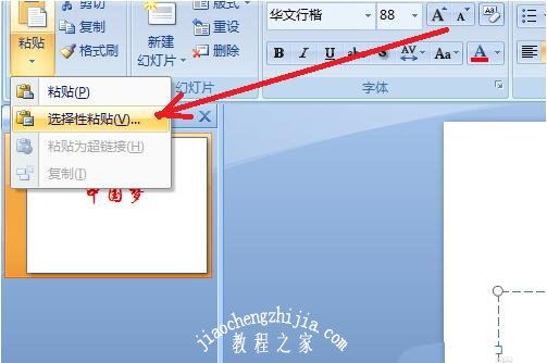 3、第一种颜色设置完成后,我们选中并复制“中国梦”这三个字,再点左上角的粘贴---->"选择性粘贴“。