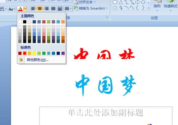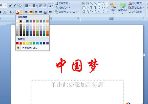 2、然后,把“中国梦”这三个字设置好第一种颜色,我们的第一颜色使用红色,字体用行楷,如下图: