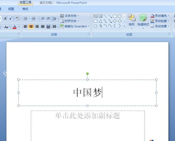 1、首先,我们打开演示文档,在本框中输入需要设置“一字双色”的文字内容内容,例:“中国梦”。
