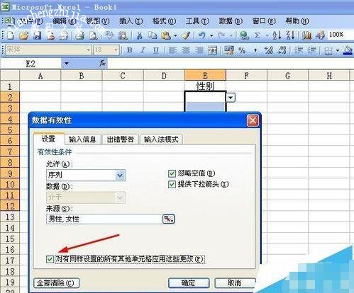 3、在数据有效性界面,勾选对同样设置的所有其他单元格应用这些更改