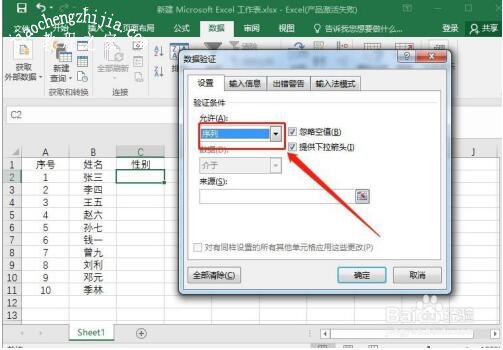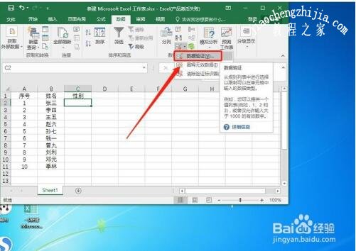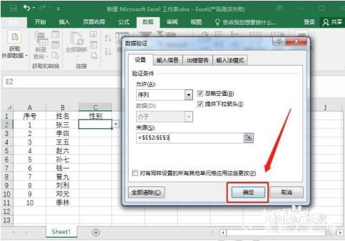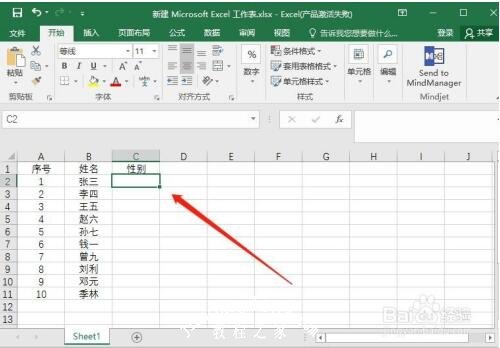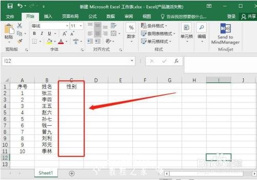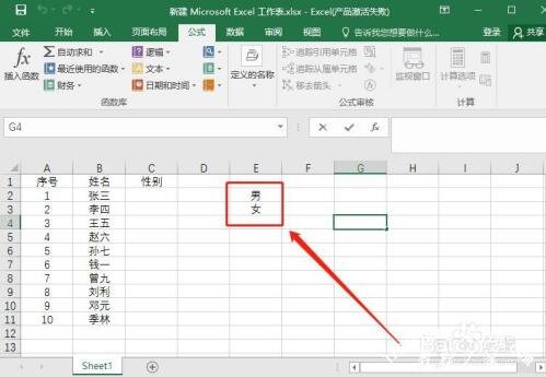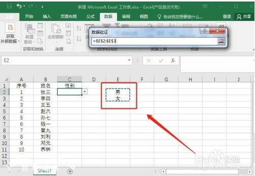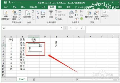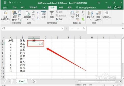 输入数据如图,接下来给性别这一列设置下拉菜单,选项为男或者女。