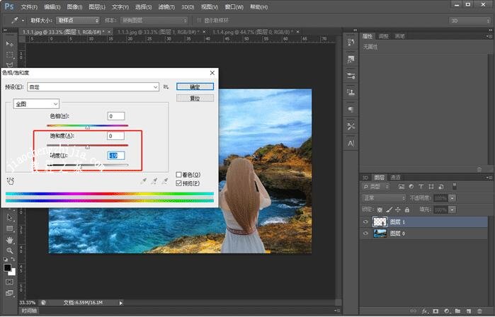 9、将人物背影移动至风景图上之后,可以看到人物背影的亮度很高,可以使用Ctrl+U打开色相/饱和度,调整明度、饱和福到合适位置,点击确定保存设置;