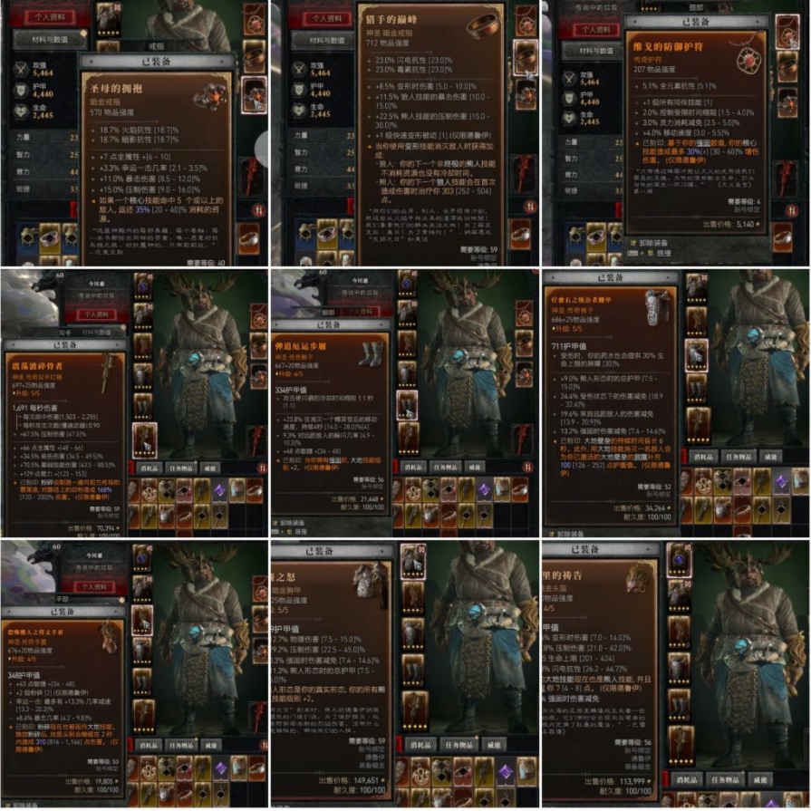 其中个人认为 暗金头 恐怖熊人 震荡波 强固增伤 莉莉丝暗金戒指比较核心 其他部位混搭问题不太大,我这里带了猎手狼人暗金戒指是因为没有更好的选择,特效基本没用。