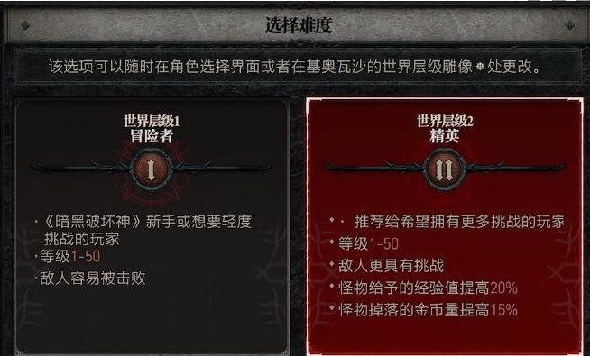 在《暗黑破坏神4》中,玩家在创建角色进入游戏时,可以在世界层级1和世界层级2中选择,此处推荐玩家选择世界层级1。