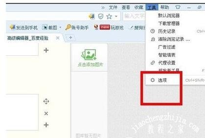 1、打开浏览器,进入主页面。我们这里找到“工具”这一选项。找到工具选项后,然后我们点击打开它。